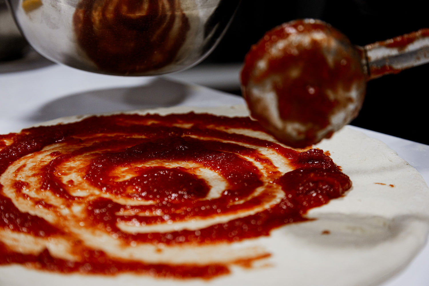 Topping the pizzas starts with spreading the sauce and selecting fresh toppings from the provided selection. After the course, students will be provided with a pizza box to take home any leftover pizza they made as well as dough balls to make their own pizza at home (bring a cooler).